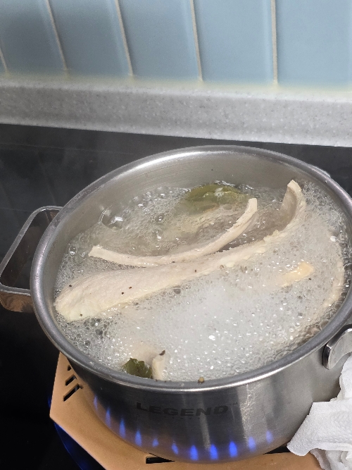데칠 때 후추, 월계수, 소주를 넣고 한 20분 정도 삶았어요.