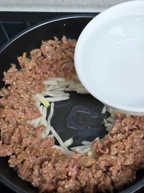 다짐육은 뭉쳐있는 부분이 없게끔 풀어가며 무 위에 올려주세요.