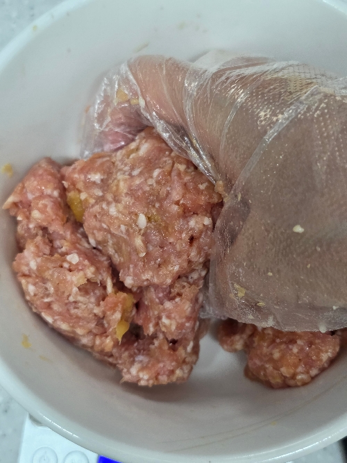 3. 볼에 다짐육 150g, 다진 마늘 1/3T, 미림 1/2T, 간장 1/2T를 넣어 버무려 주세요.