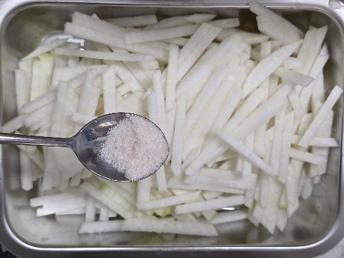 2. 볼에 채 썬 무, 소금 1/2T를 넣고 버무려 재워주세요.
