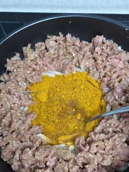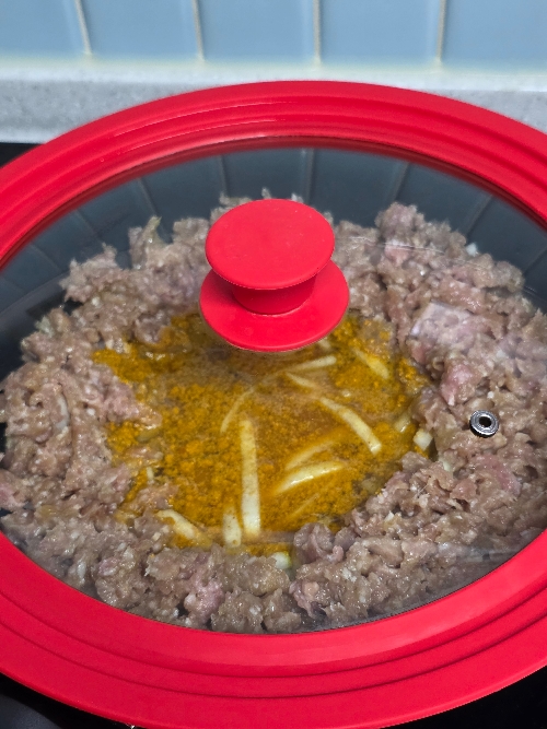 5. 무 위에 다짐육을 올리고 올리브유 2바퀴를 두른 후 가운데 물 200ml, 토마토케첩 듬뿍 1T, 카레가루 2T를 넣고 뚜껑을 닫아 중불에 3분 졸여주세요.