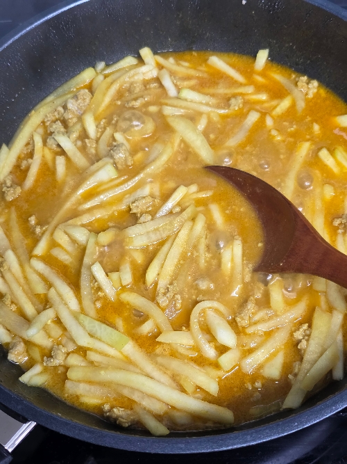 필요한 재료 : 무 300g, 돼지고기 다짐육 150g, 소금 1/2T, 물 200ml, 밥, 쪽파, 다진 마늘 1/3T, 미림 1/2T, 간장 1/2T, 토마토케첩 듬뿍 1T, 카레가루 2T, 올리브유 1T