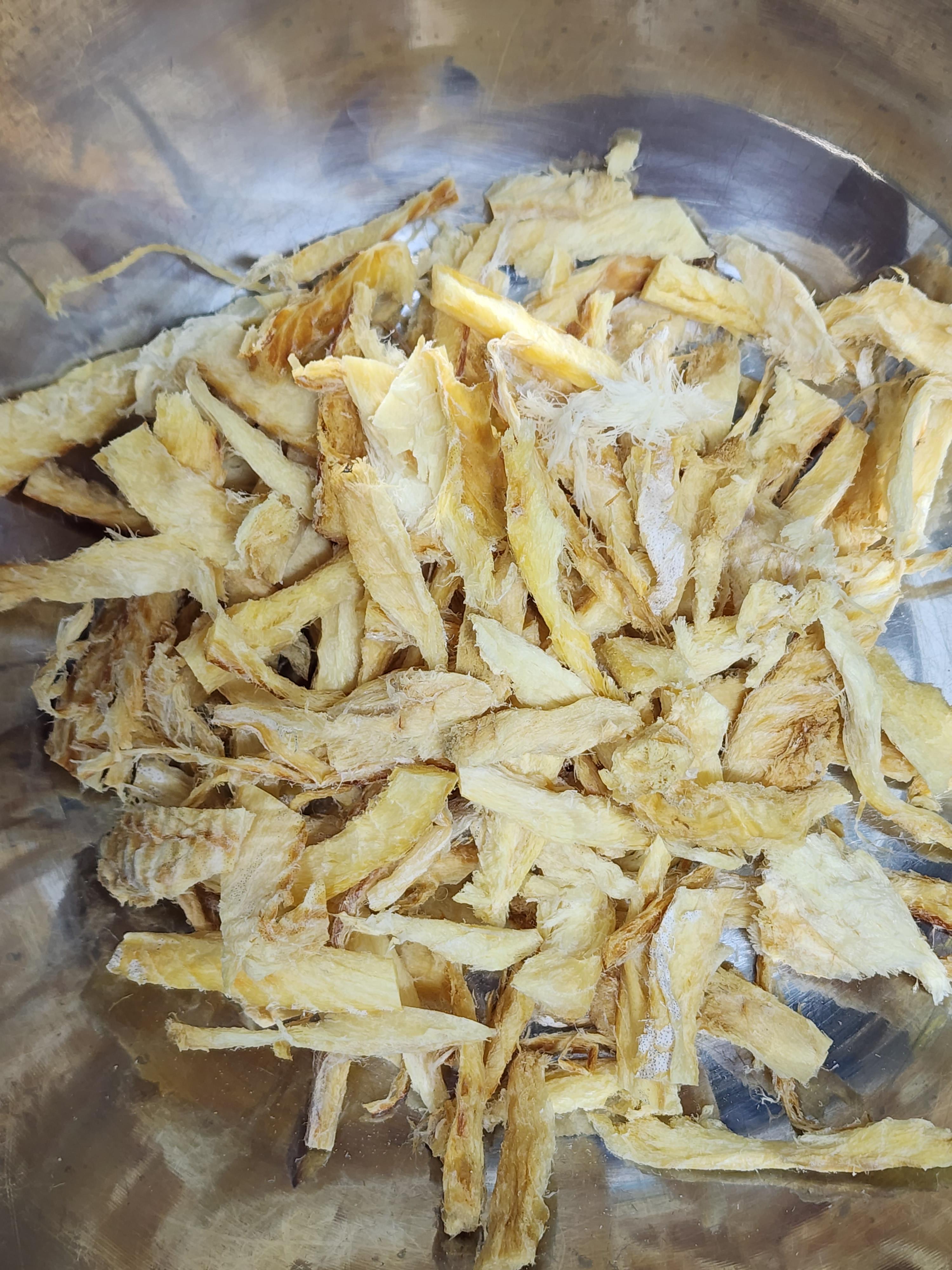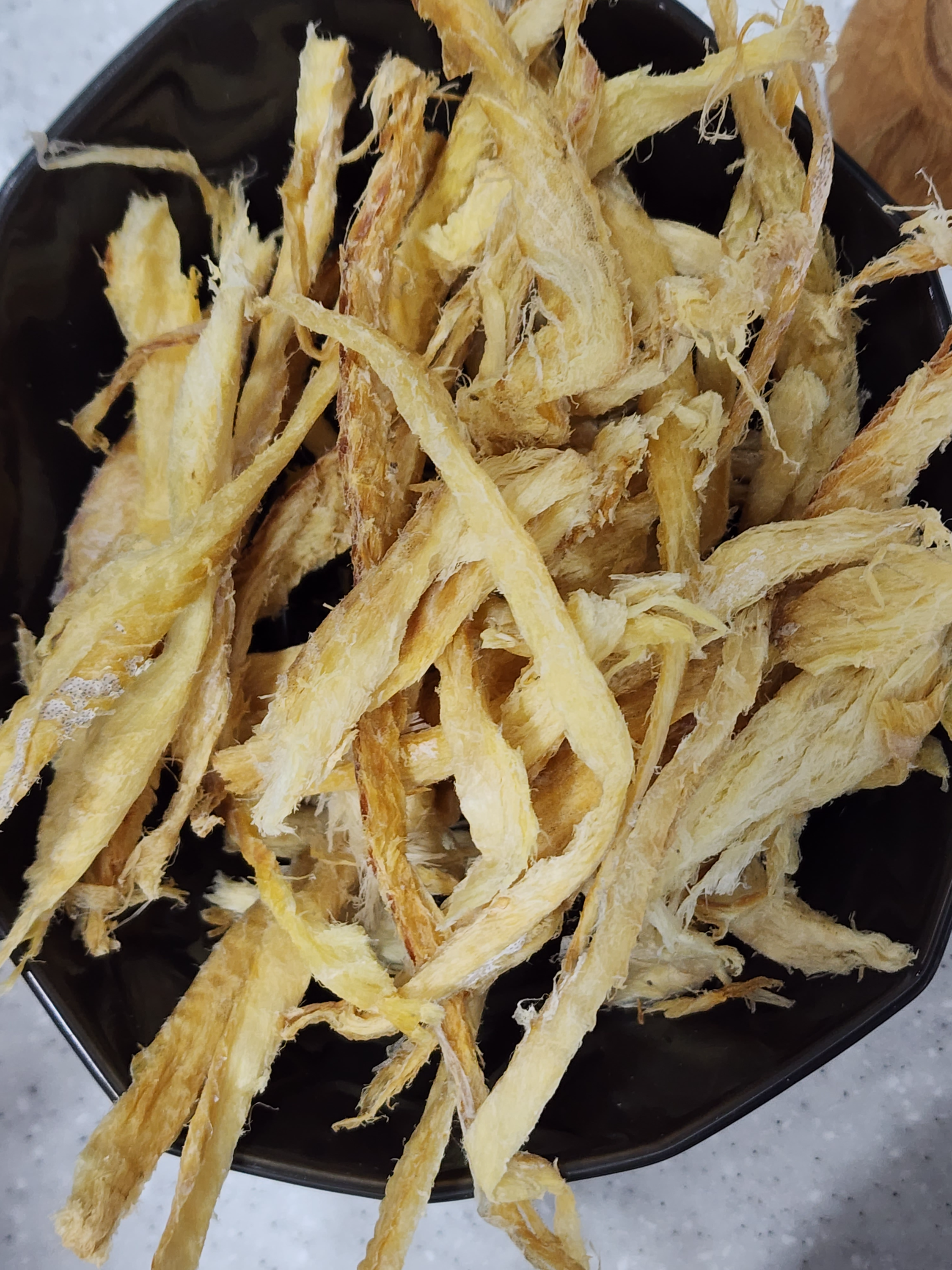 1. 황태채 50g을 손가락 두 마디 정도 크기로 자른 뒤 물에 헹구고 물기를 짜주세요.