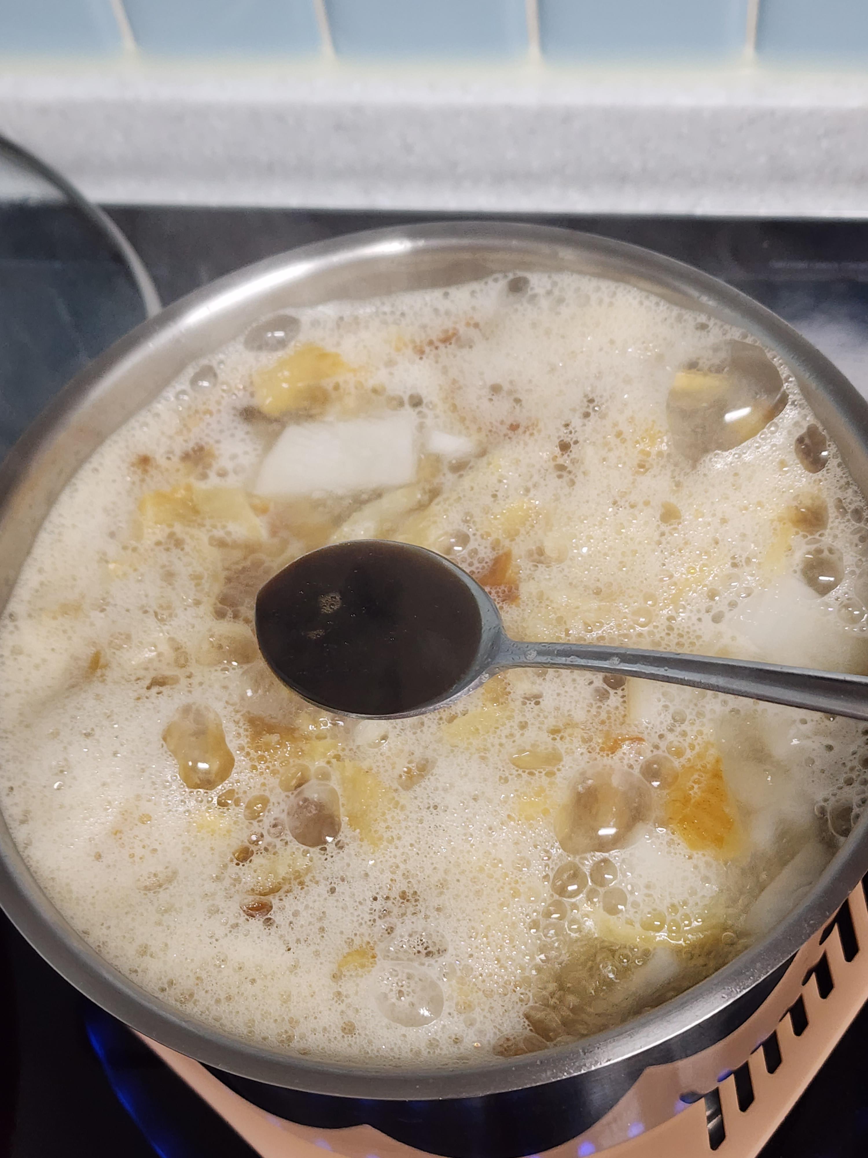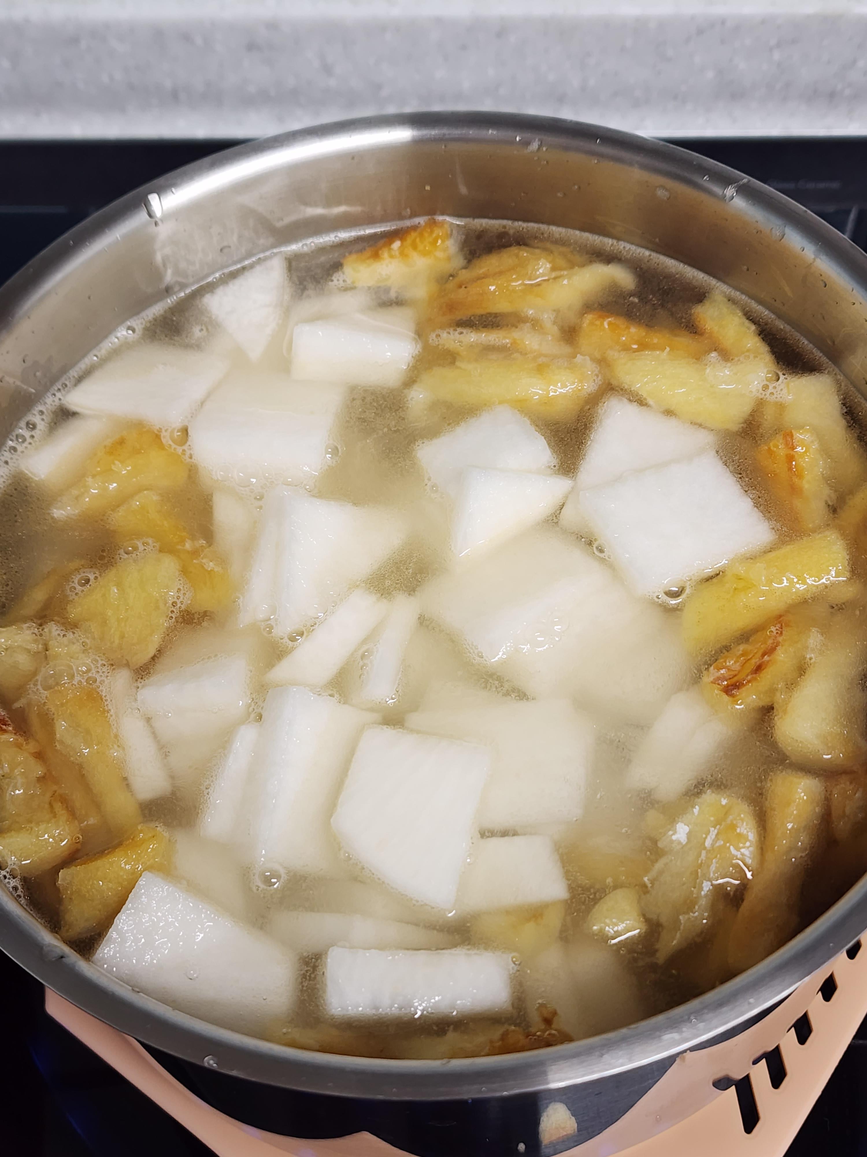4. 마늘이 갈색으로 변하면 물 2L, 썰어둔 무를 넣고 강불에서 한 김 끓여주세요.