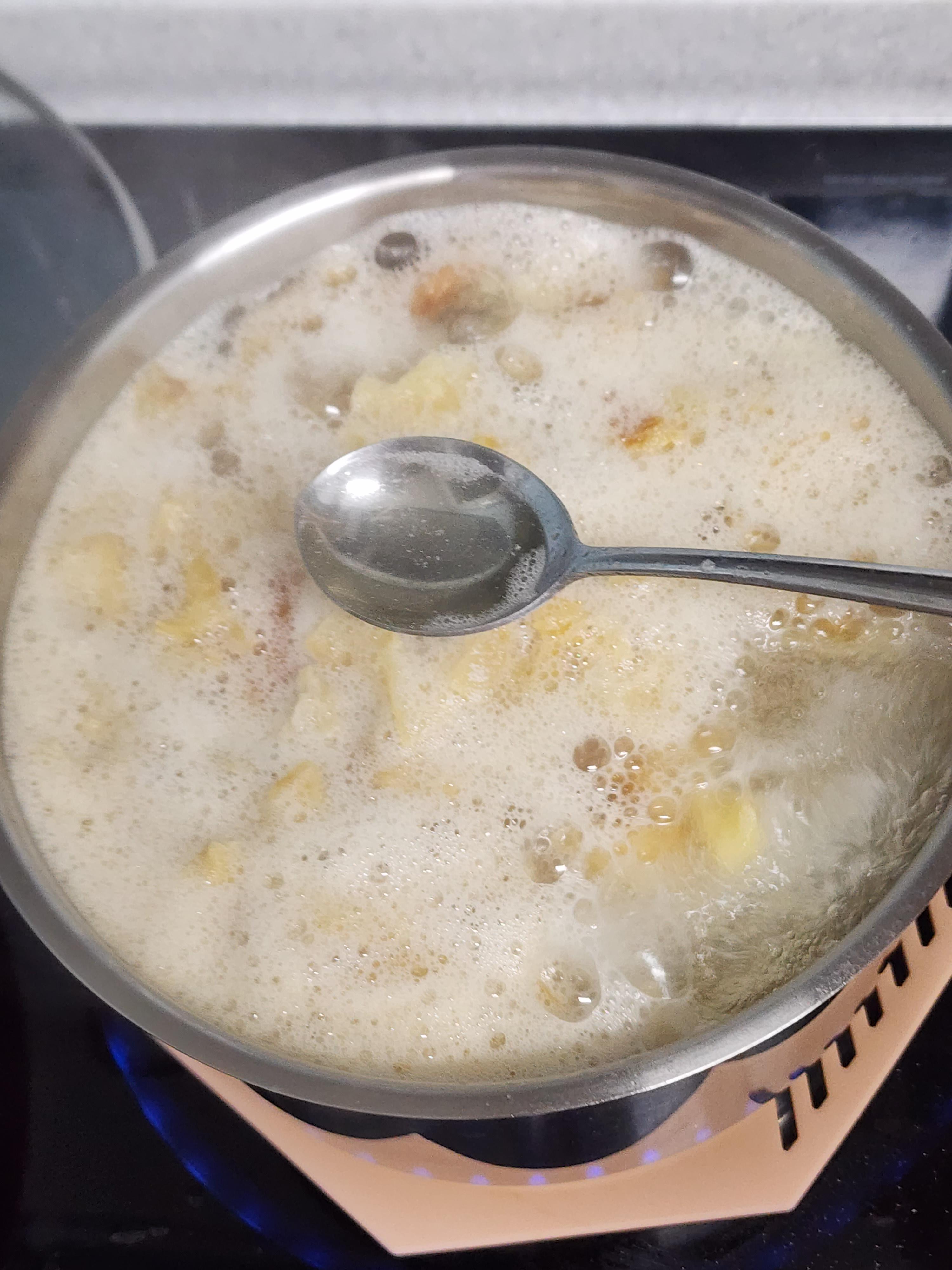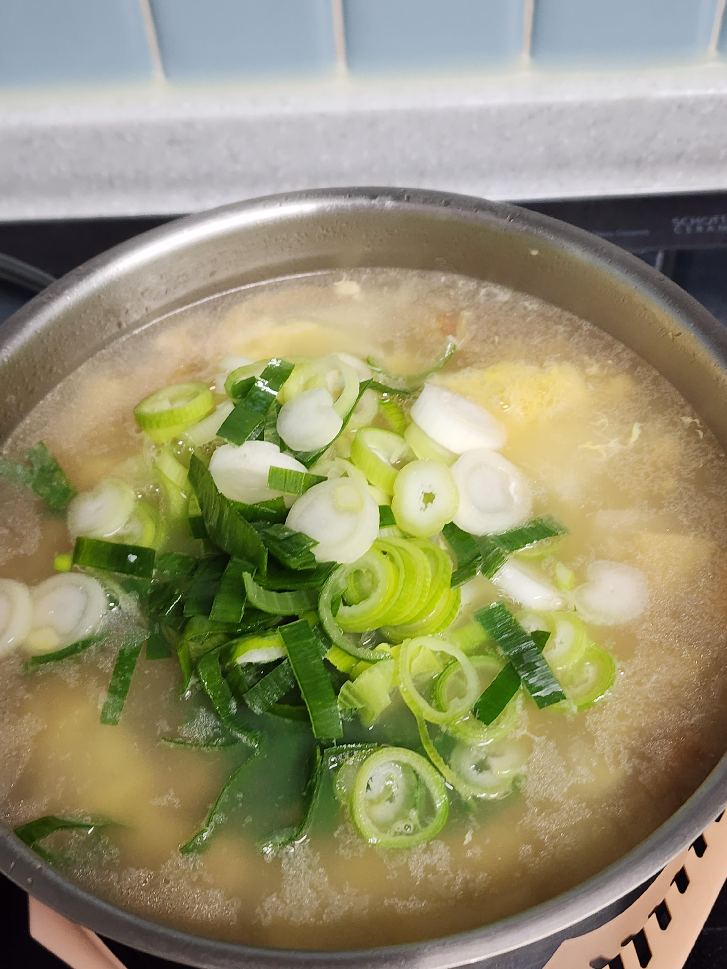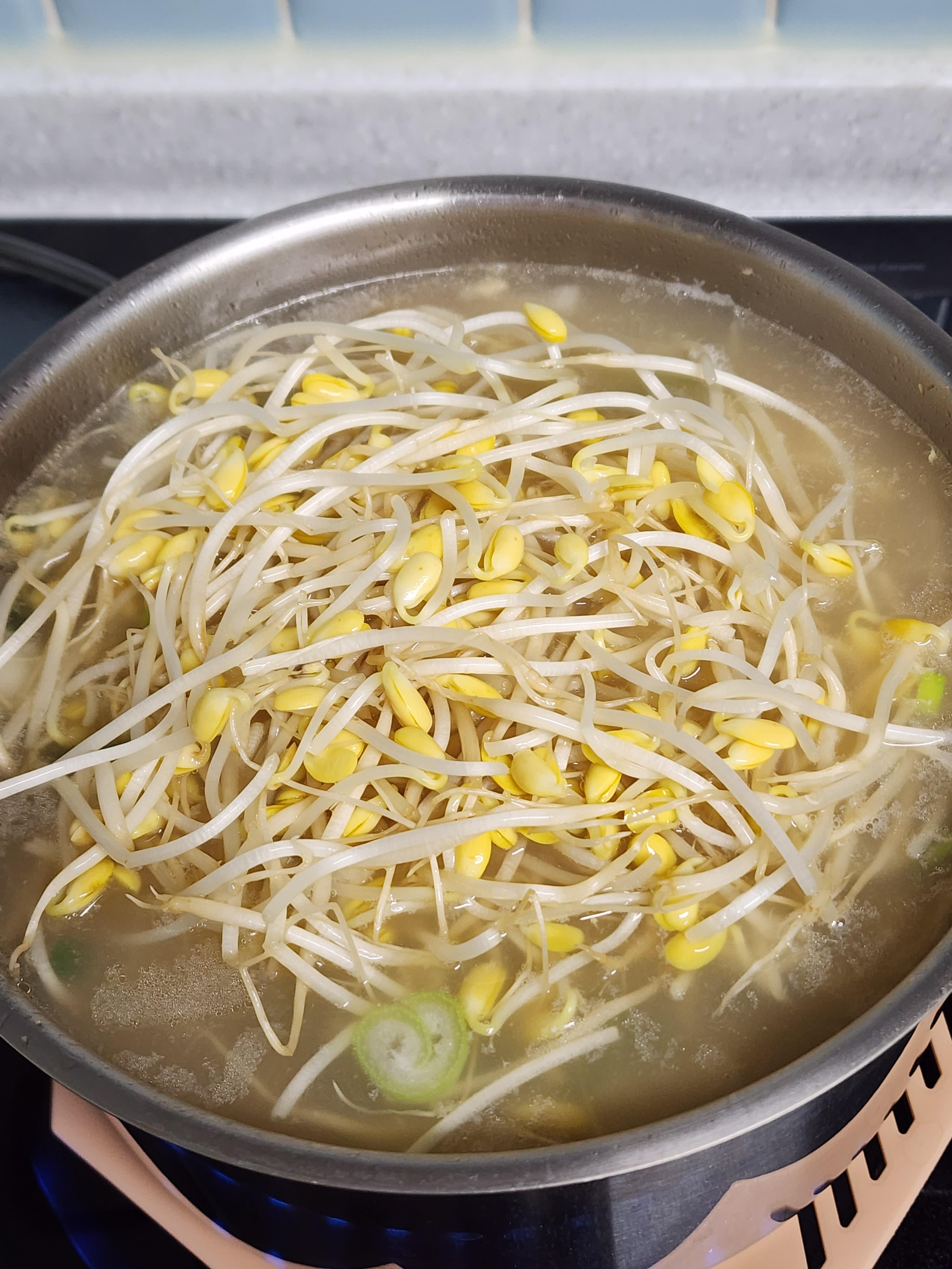 7. 썰어둔 대파, 손질한 콩나물 200g을 넣고 뚜껑 닫아서 3분 동안 끓여주시면 완성입니다.