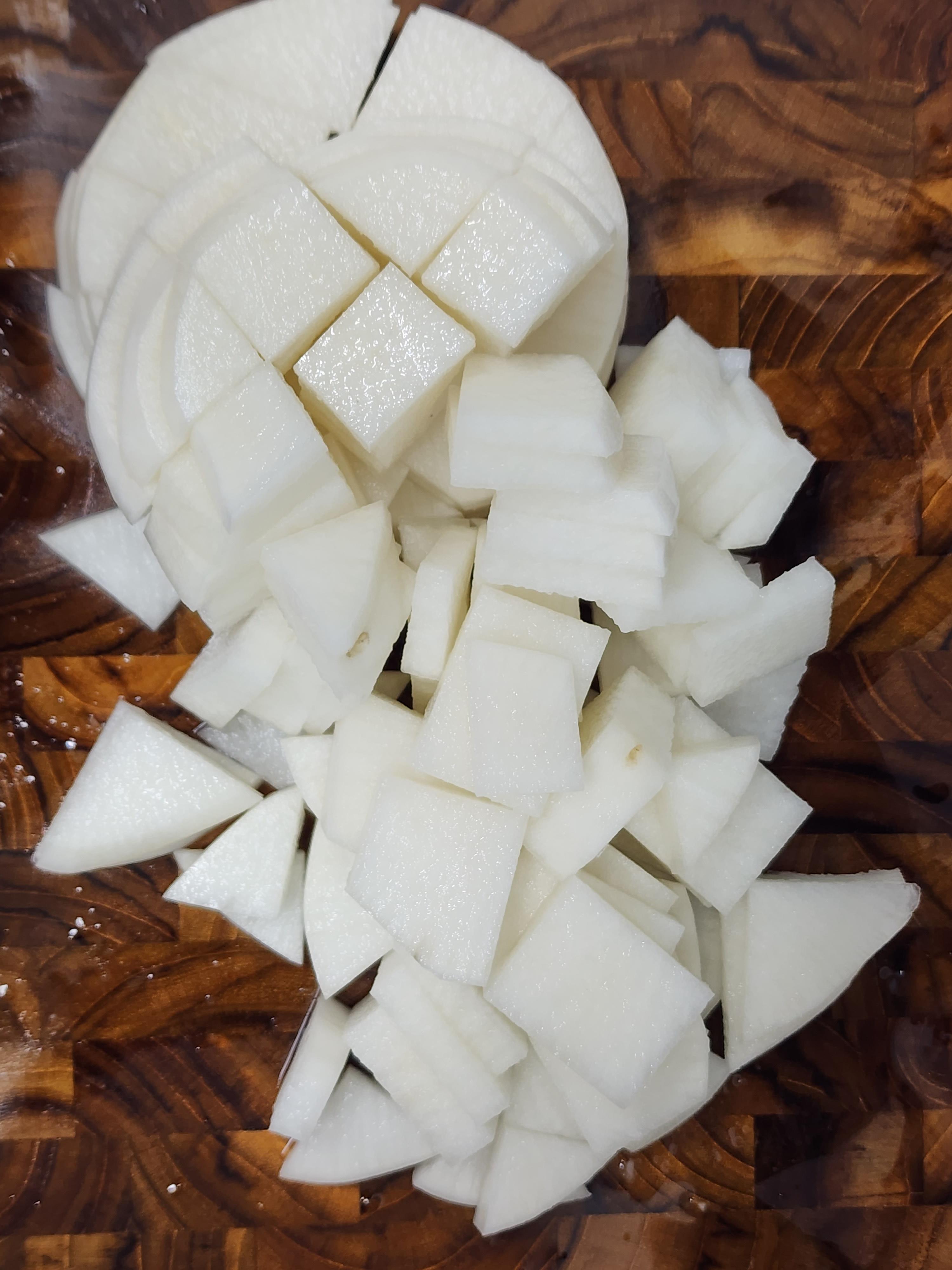 2. 무 500g은 나박 썰기로 썰어주고 두부 1/2모는 황태채모양으로 썰어주고 대파 1대는 송송 썰어주세요.
