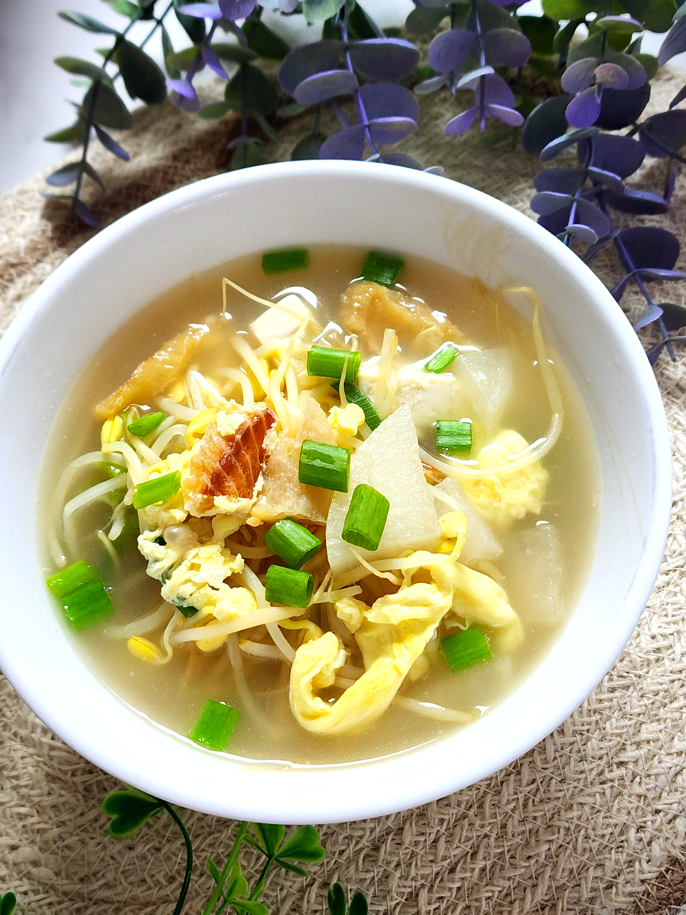 필요한 재료 : 황태채 50g, 무 500g, 두부 1/2모, 콩나물 200g, 대파 1대, 달걀 2개, 다진 마늘 1/2T, 참기름 3T, 식초 1T, 국간장 3T, 참치액 3T, 굵은소금 1/2T, 물 2L