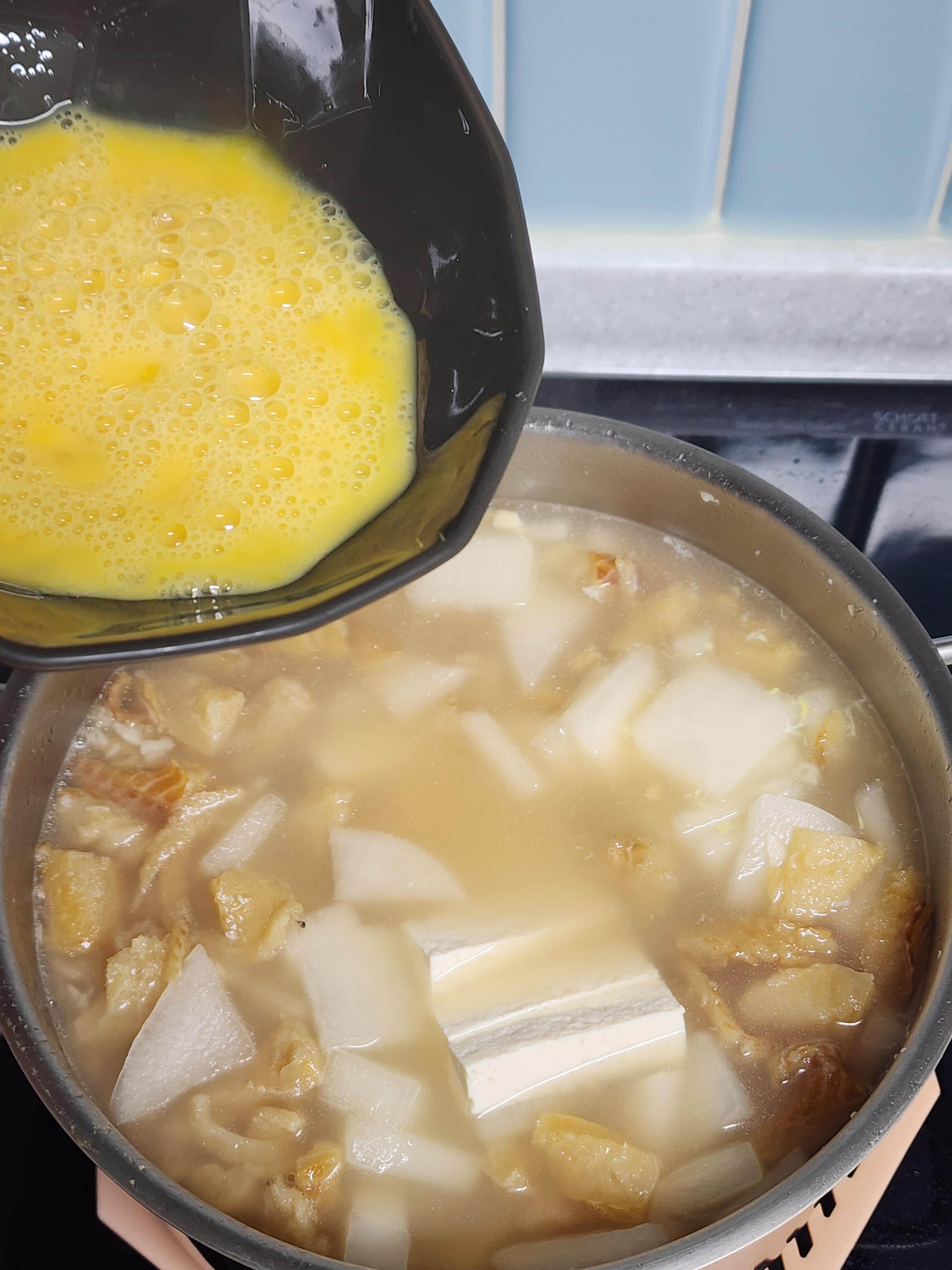 6. 두부를 넣고 계란 2개를 풀어서 최대한 얇고 가늘게 주워주고 불을 끄고 잔열로 3분을 익혀주세요.