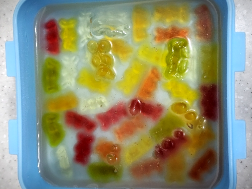 1. 그릇에 하리보를 넣고 사이다를 젤리가 잠길 정도로 부워주고 냉장실에서 충분히 불려주세요.