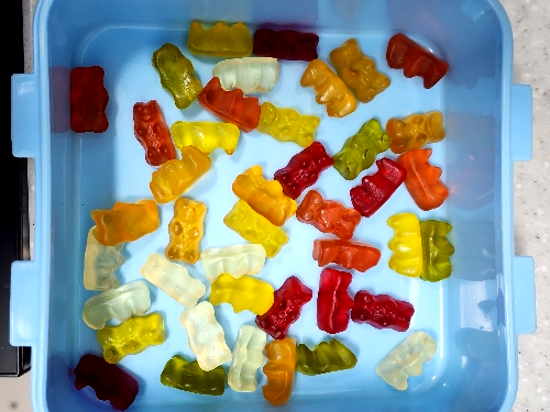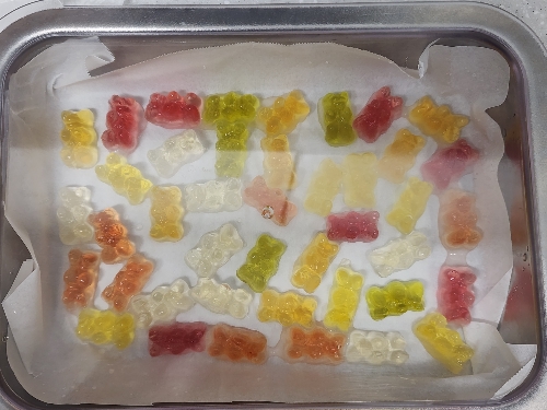 2. 충분히 불린 하리보를 종이포일을 하나 깔고 그 위에 나중에 떼어내기 쉽게 따로따로 놓아주세요.